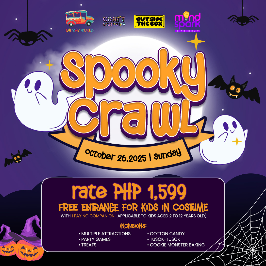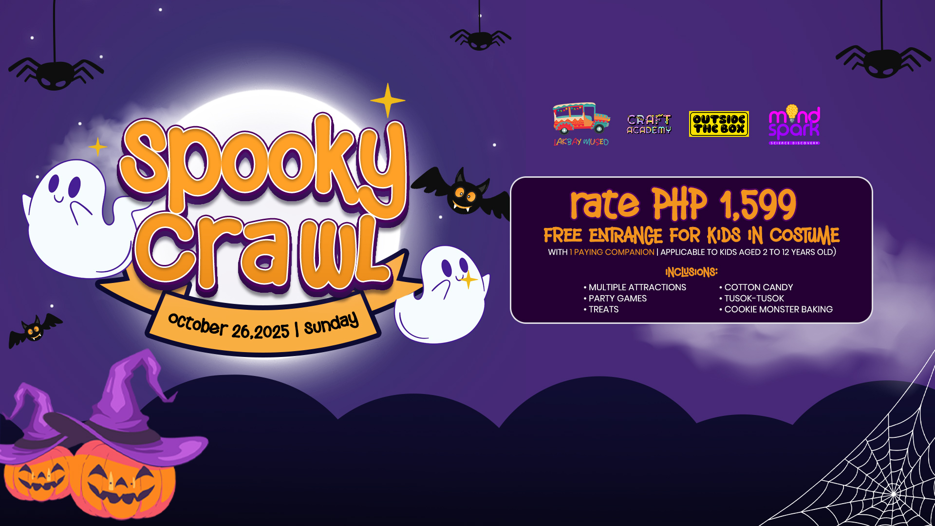 This October 26, enjoy a thrilling Halloween adventure across Lakbay Museo, MindSpark, Outside the Box, and Craft Academy — packed with games, tours, cookie decorating, and a spooky party! Kids in costume (ages 2–12) get FREE entrance with a paying companion.